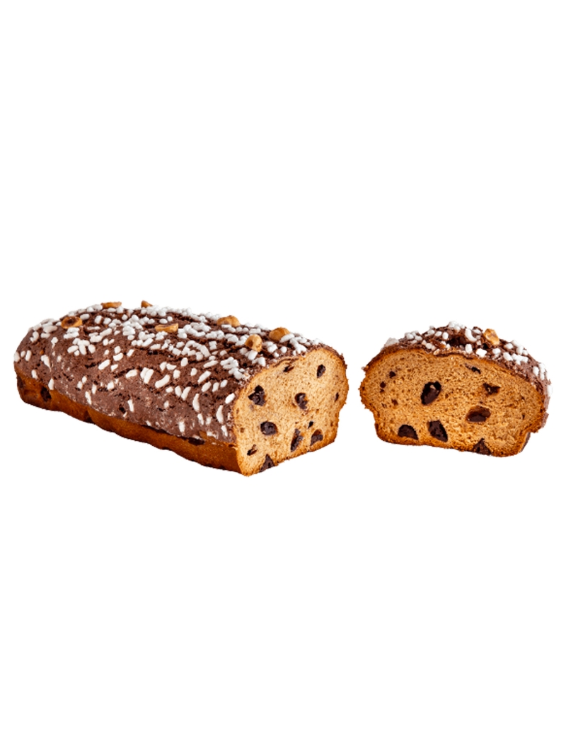 Dolce lievitato naturalmente di forma di filone ricoperto con glassa di nocciole Piemonte IGP e cacao. La pasta, di colore giallo è arricchita con cioccolato fondente.
