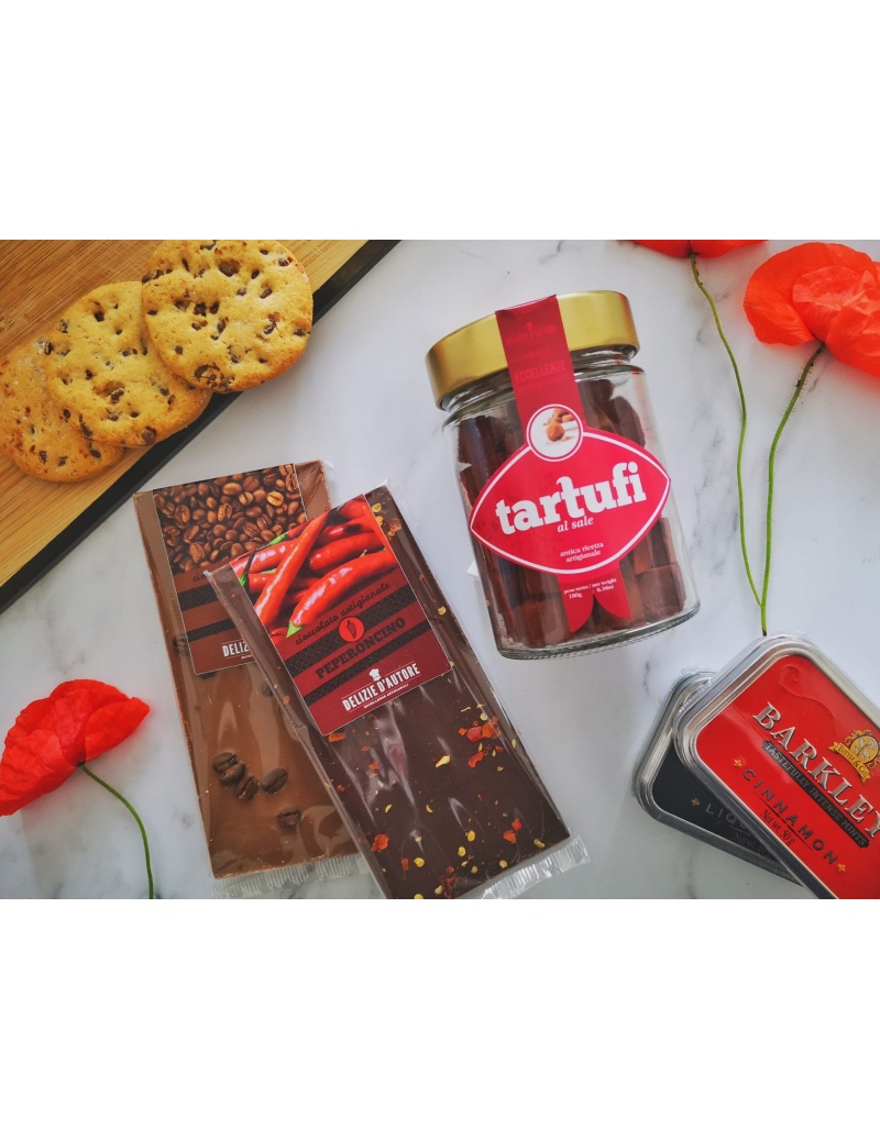 Golosi tartufi di "Delizie d'autore" con cioccolato fondente, crema e sale marino, ricoperti di cacao. Il sale marino esalta la dolcezza del cioccolato, donando un sapore molto particolare e piacevole. Tutta la squisitezza di un prodotto artigianale.