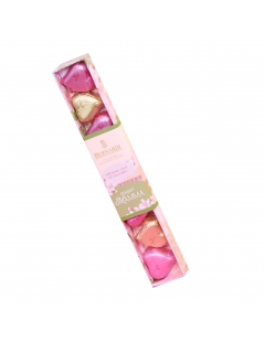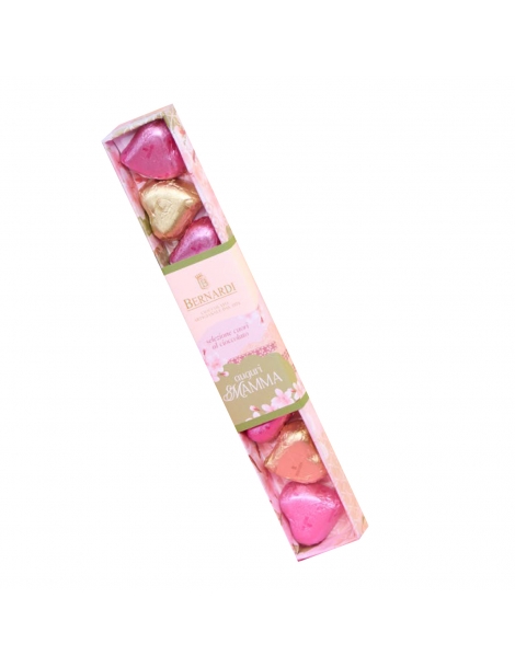 All’interno della confezione sono custoditi deliziosi cioccolatini a forma di cuore, avvolti in stagnole eleganti color oro e rosa. Ogni cuore racchiude tutto il gusto del cioccolato cremoso e avvolgente, pensato per regalare un momento di dolcezza a una persona speciale.