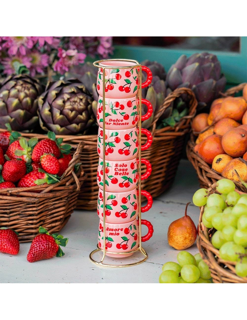L'impilabile da sei tazzine, dalle forme morbide e colori accesi, impreziosita da dolci ciliegie, regalerà un tocco di allegria alla tua tavola!