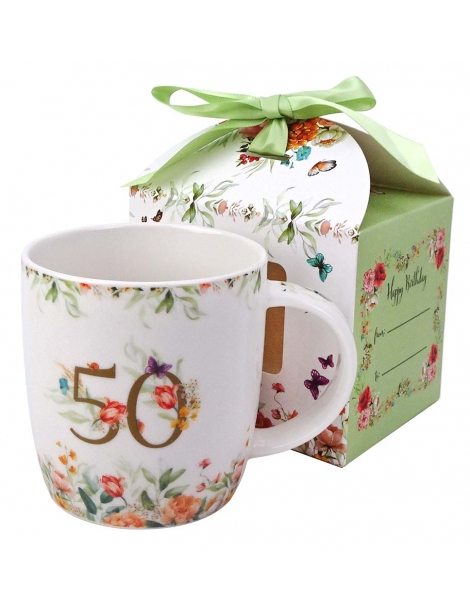 La tazza di compleanno "50" in una scatola con un fiocco, è caratterizzata da un colore bianco crema naturale con una lucentezza delicata e una resistenza e durata eccezionali, mantenendo leggerezza e finezza.